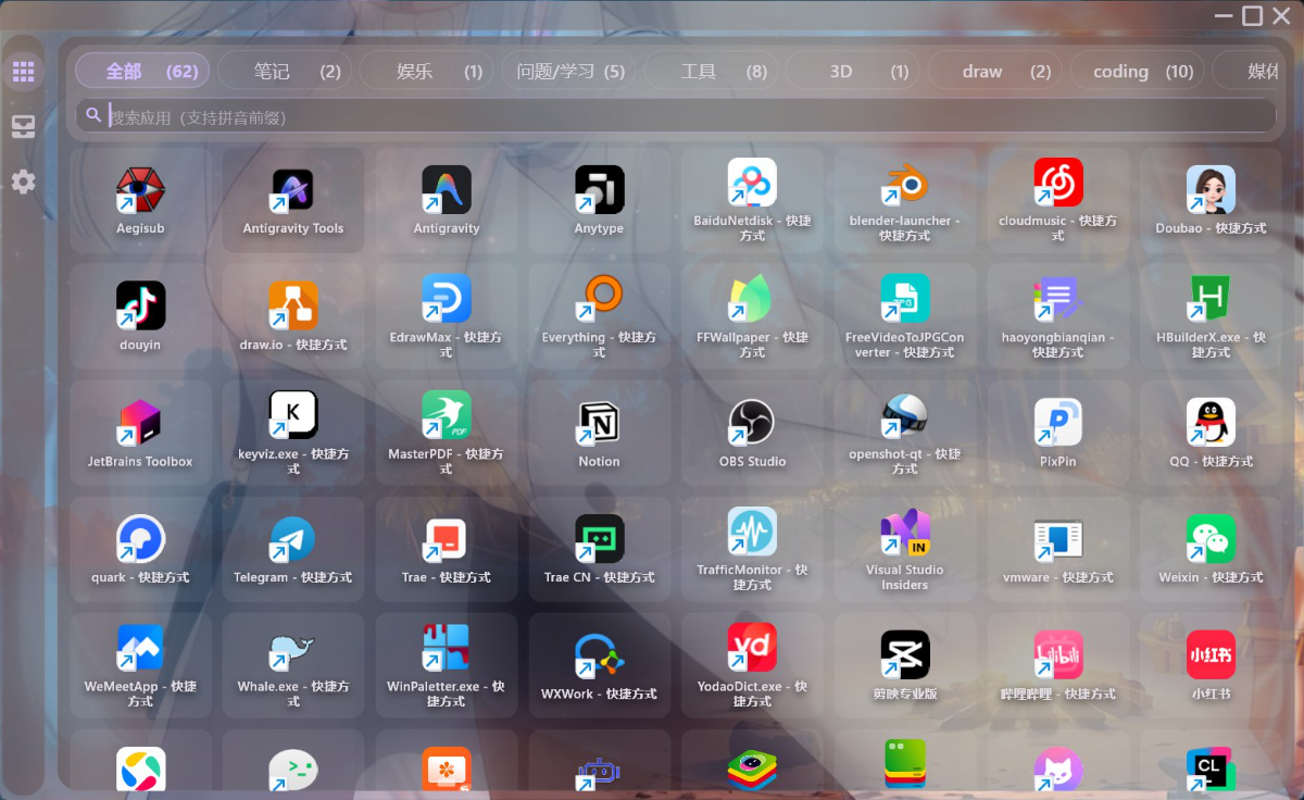 核心亮点:超轻量:CPU占用≈0%,内存仅~280MB,安装包仅11.8MB全局热键:Ctrl+Shift+Space 一键唤醒智能搜索:支持拼音首字母模糊匹配磨砂玻璃:颜值在线,融入桌面收纳盒:文件/文件夹分类悬浮展示磁吸隐藏:拖到左上角自动吸附隐藏